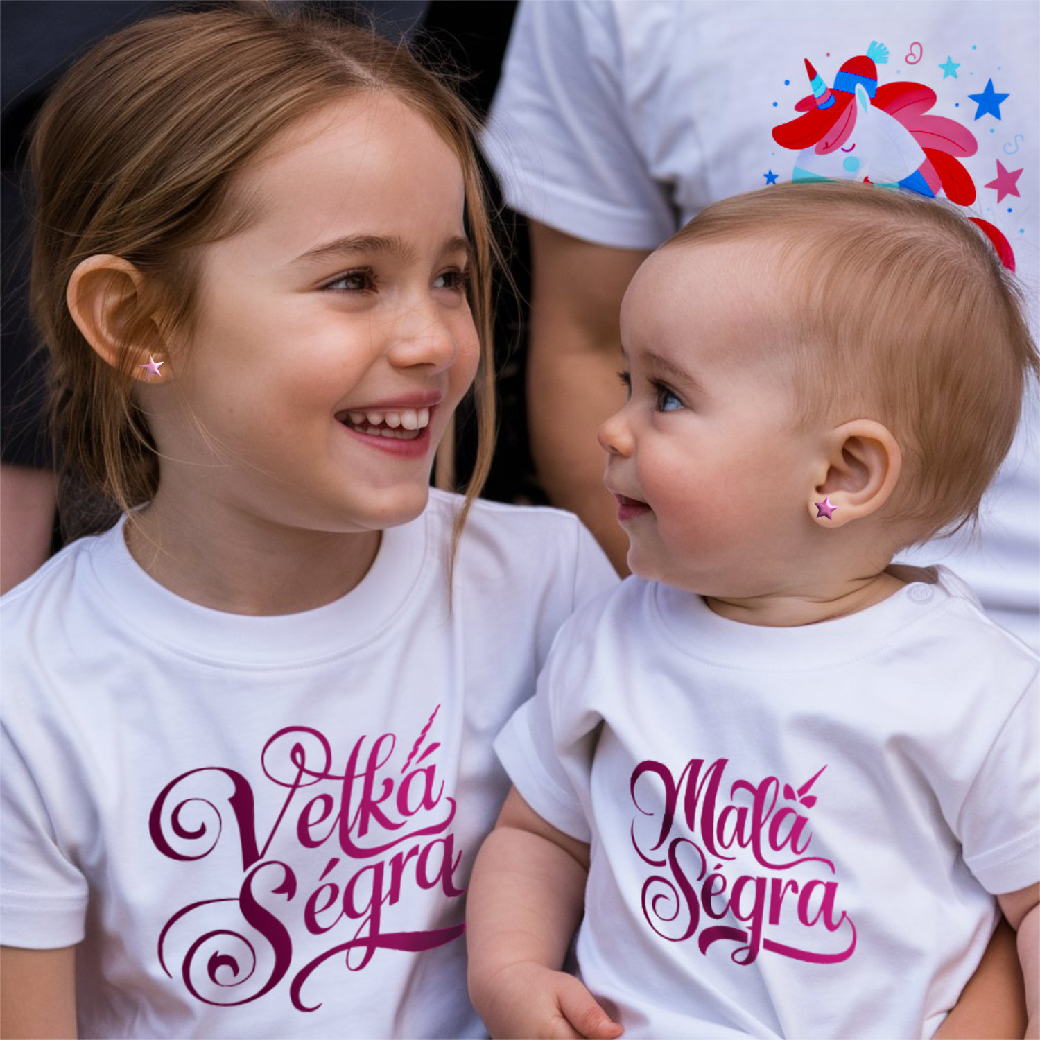 Doplňte kolekci tričkem "Malá ségra", které je navrženo ve stejném stylu jednorožců. Toto tričko je ideální pro mladší sestru, která se může cítit výjimečně vedle své starší sestry. Perfektní pro sladěné outfity na rodinné focení, oslavy nebo jako nádherný dárek. Tričko je vyrobeno z měkkého a pohodlného materiálu, aby vaše malá princezna měla maximální komfort. Tyto trička tvoří dokonalou dvojici pro vaše malé slečny, které si zamilují svůj nový sourozenecký styl!